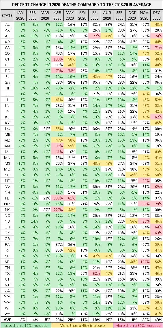 Chapter 4 of the Guide contains 3 tables showing how much deaths changed in every state, each month in the years 2020, 2021, and 2022, compared to the monthly average in 2018-2019. These tables had to be abbreviated to a half-year in the digital version, which doesn’t seem to like large tables. Because I think these tables are important, I’m posting them here in full, to ensure they are available to everyone.
