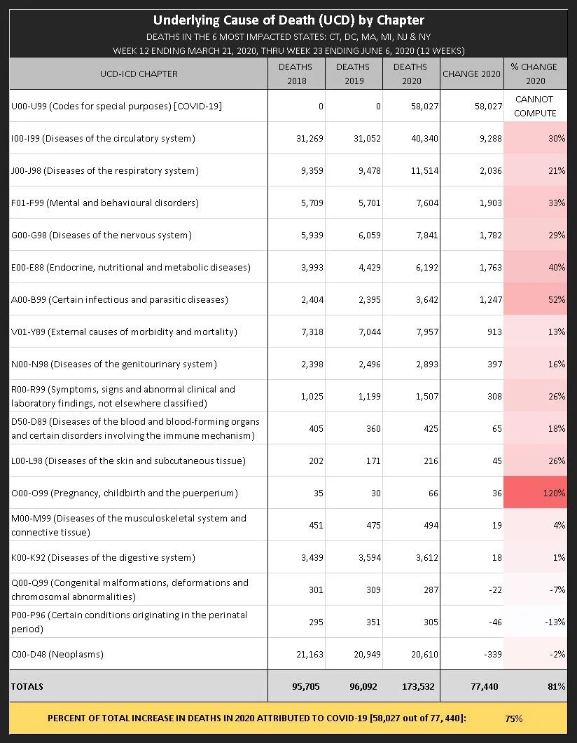 6) Table 6. For Underlying Cause of Death (UCD) during the first 12-week death surge in the 6 states of maximum impact, run this search: http://wonder.cdc.gov/controller/saved/D176/D450F015